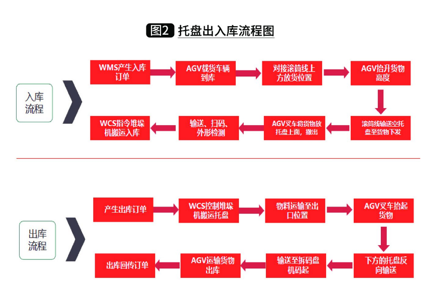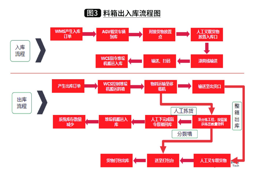 托盤出入庫流程(如圖2)所示,料箱出入庫流程(如圖3)所示。