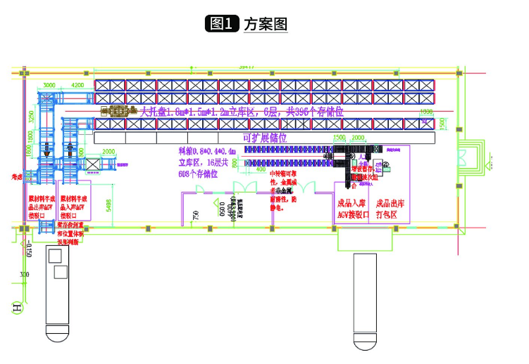 (1) 滿足客戶需求的原則,貨物后期會有長度超過目前儲存貨物尺寸的情況,儲存量低,出入庫效率低,為解決這種特殊儲存要求,將規劃圖中的托盤庫最下面一列貨架設置成可擴展儲位,兩個貨位合并占中只放置一托貨物。
