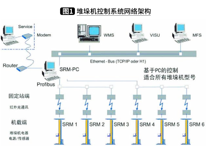 武漢卷煙廠物流車間共配置有23臺巷道堆垛機(jī),分散部署在6個(gè)自動化立體倉庫中,由DEMATIC公司生產(chǎn)制造堆垛機(jī)控制系統(tǒng)主要分為地面控制站和機(jī)載控制柜兩個(gè)部分,地面控制站與機(jī)載控制柜之間采用PROFIBUS方式進(jìn)行通訊,之間通過紅外光通訊建立數(shù)據(jù)連接。地面控制站工控機(jī)底層采用一套WINAC控制系統(tǒng),并部署SCS存儲控制系統(tǒng),通過紅外光通訊傳輸指令控制位于堆垛機(jī)上的ET200S和S120驅(qū)動系統(tǒng)WINAC控制系統(tǒng)與WCS倉儲調(diào)度系統(tǒng)通過工業(yè)以太網(wǎng)建立數(shù)據(jù)連接。以成品自動化立體化倉庫堆垛機(jī)控制系統(tǒng)為例其控制系統(tǒng)網(wǎng)絡(luò)架構(gòu)如(圖1)所示。