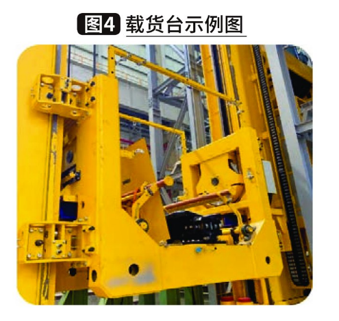如(圖4),載貨臺主要由起升導向輪、金屬框架等組成。載貨臺上裝有存取卷料貨物的貨叉伸縮機構、用于卷料貨物導向的導向架、鋼絲繩滑輪,以及用于距離和位置檢測的開關等。載貨臺通過起升機構的電動機使鋼絲繩上下移動,從而帶動載貨臺沿立柱的垂直方向升降。