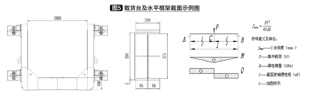 (圖5)中的左圖為載貨臺示意圖,載貨臺框架是由矩形管、方管、鋼板等金屬機構拼接焊接而成。右圖為載貨臺水平框架截面圖,使用200X400工字鋼與鋼板焊接而成,根據該截面尺寸可以使用軟件 (AutoCAD、Caxa等) 計算出其慣性矩,用于計算水平框架的靜剛度。